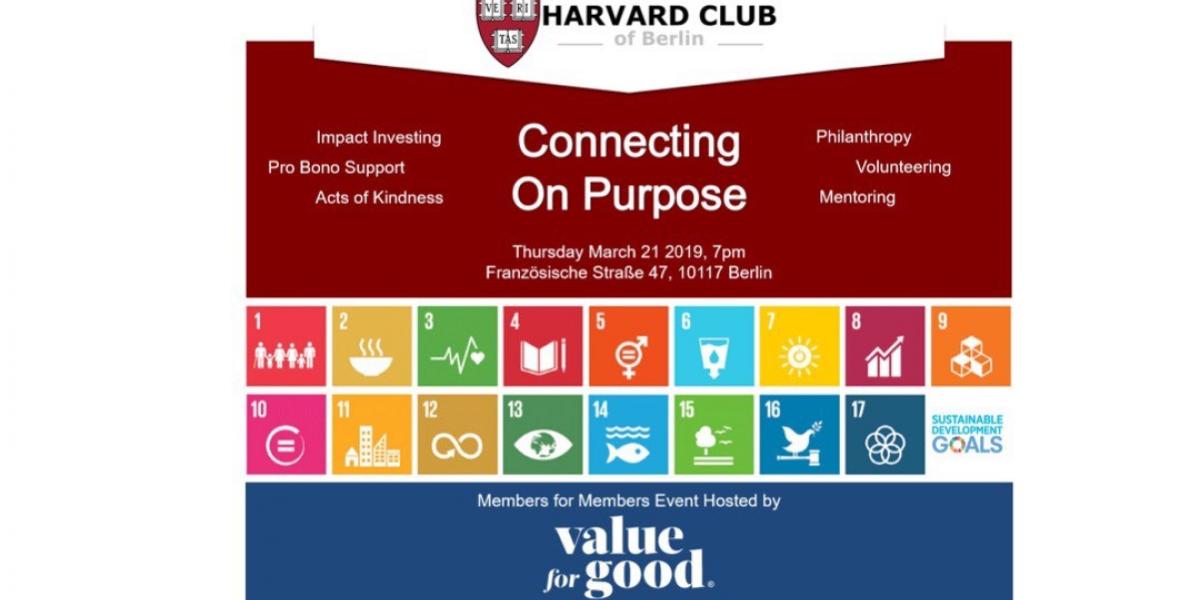 Then come join us at our next Harvard Alumni Club of Berlin (HCB) Members for Members event on Thursday March 21: "Connecting on Purpose" - an evening of networking and peer-to-peer exchange on the topic of making an impact.